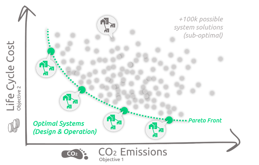 Mathematical Optimization is a sophisticated analytical tool that allows users to describe complex real-world problems in a mathematical model and find a solution that optimizes an objective while adhering to user-defined constraints.It has a wide range of applications in manufacturing, scheduling, transportation, economics, control engineering, marketing, policy modeling, etc. Sympheny uses Mathematical Optimization to identify cost-effective and emission-minimizing system designs and operation strategies for new and existing sites.