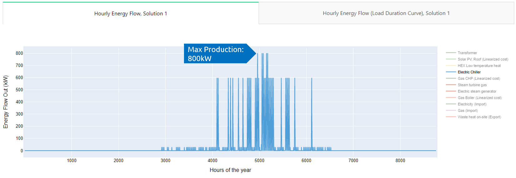 In the example below, the Chiller Candidate is dimensioned to an Optimal Capacity of 420 kW, but the maximal production in the results plot is 800 kWh/h for the combined outputs (Cooling and Waste Heat):