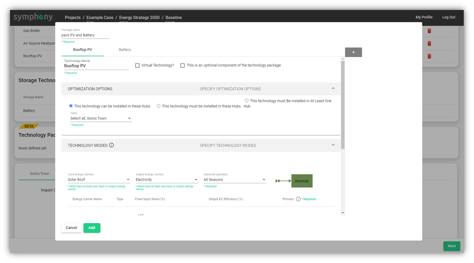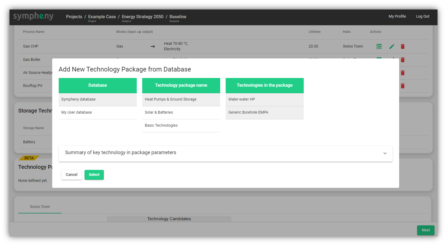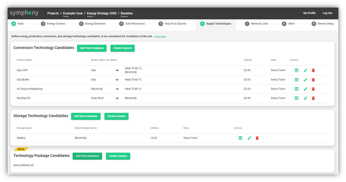 What is a technology package? A technology package in the Sympheny Web app is a group of energy conversion and/or storage technologies. As with individual technologies, a technology package can be either loaded from a database or created from scratch. You can decide whether this group of technologies must be installed together or not.