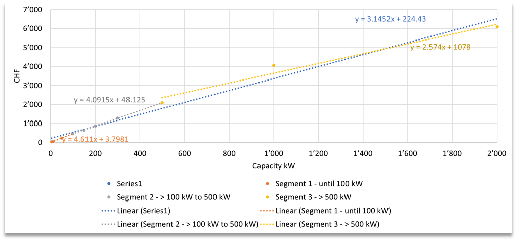 To define prices of technologies in a more detailed way than one single linearization curve, different segments can be defined. On the table below, instead of a single-curve linearization represented in blue, there curves are created for the following segments: < 100 kW, 100 to 500 kW and > 500 kW.