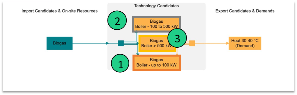The same technology can then be replicated three times: each time, with the costs mapping one of these segment curves. Through specifying maximum and minimum capacity constraints, the correct technology will be chosen, depending on the necessary capacity. Please note that adding many technologies with specified minimum capacities (> 0 kW) may result in longer solving times, due to the nature of Sympheny's algorithms.