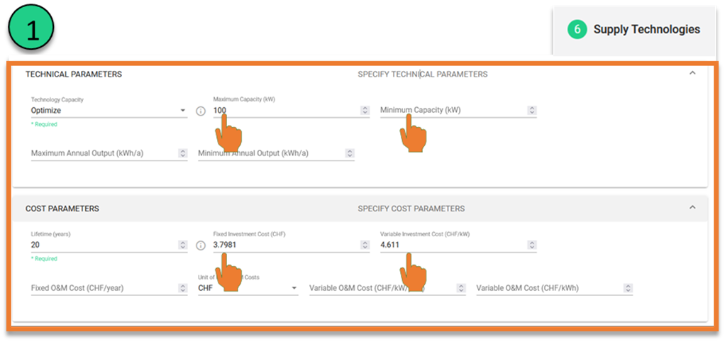 Figure 71 Set-up parameters for the first technology to use the linearized cost parameters and capacity limit