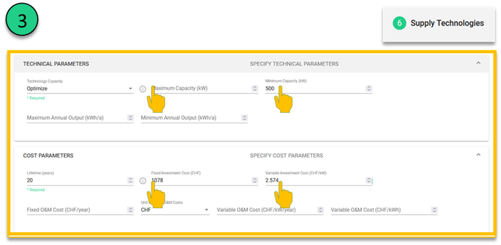 Figure 73 Set-up parameters for the third technology to use the linearized cost parameters and capacity limit