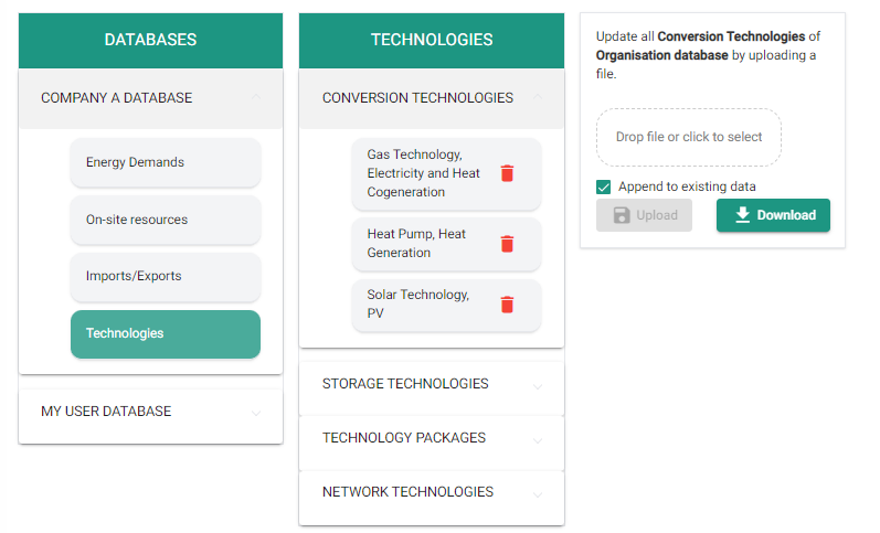 Navigate to the database and the type of data you’d like to download (e.g., Energy Demands, On-site Resources or the category of Technologies).