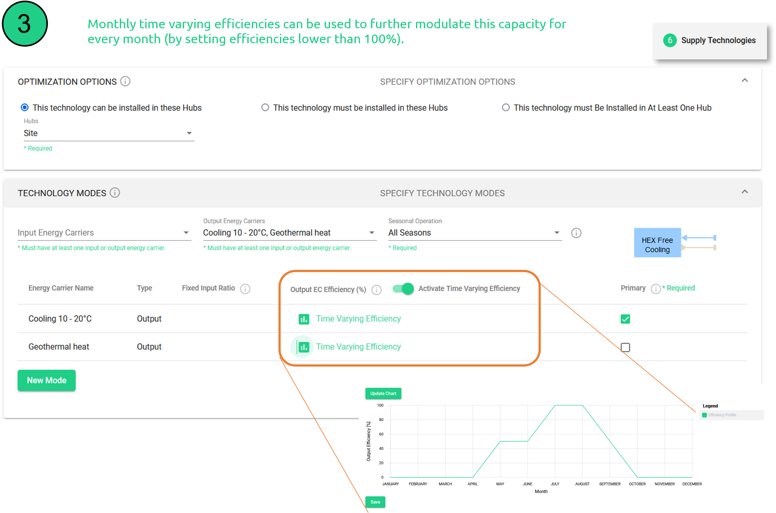 Monthly time varying efficiencies can be used to further modulate this capacity for every month (by setting efficiencies lower than 100%). This must be done for both outputs.