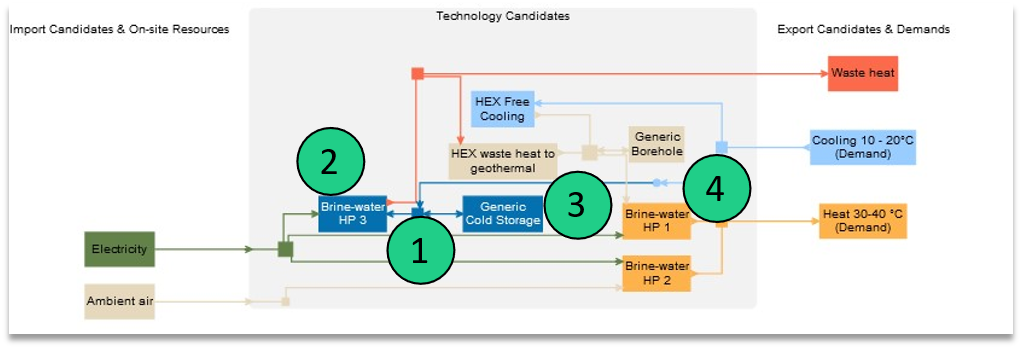 Finally, to allow for the system to cover the cooling demand with the active cooling, a virtual technology is added, transforming active cooling into cooling 10-20°C (the energy carrier of the demand).