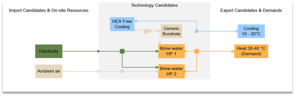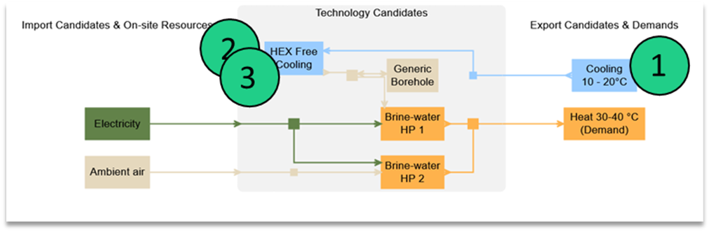 Based on the example of the Geothermal heat pump, let’s now consider that the cooling demand can also be supplied by free cooling, whenever this is possible. For doing so, a free cooling heat exchanger must be added. It is modelled as a separate technology, as we have already 3 modes in our brine-water heat pump technology (the current maximum number of modes).