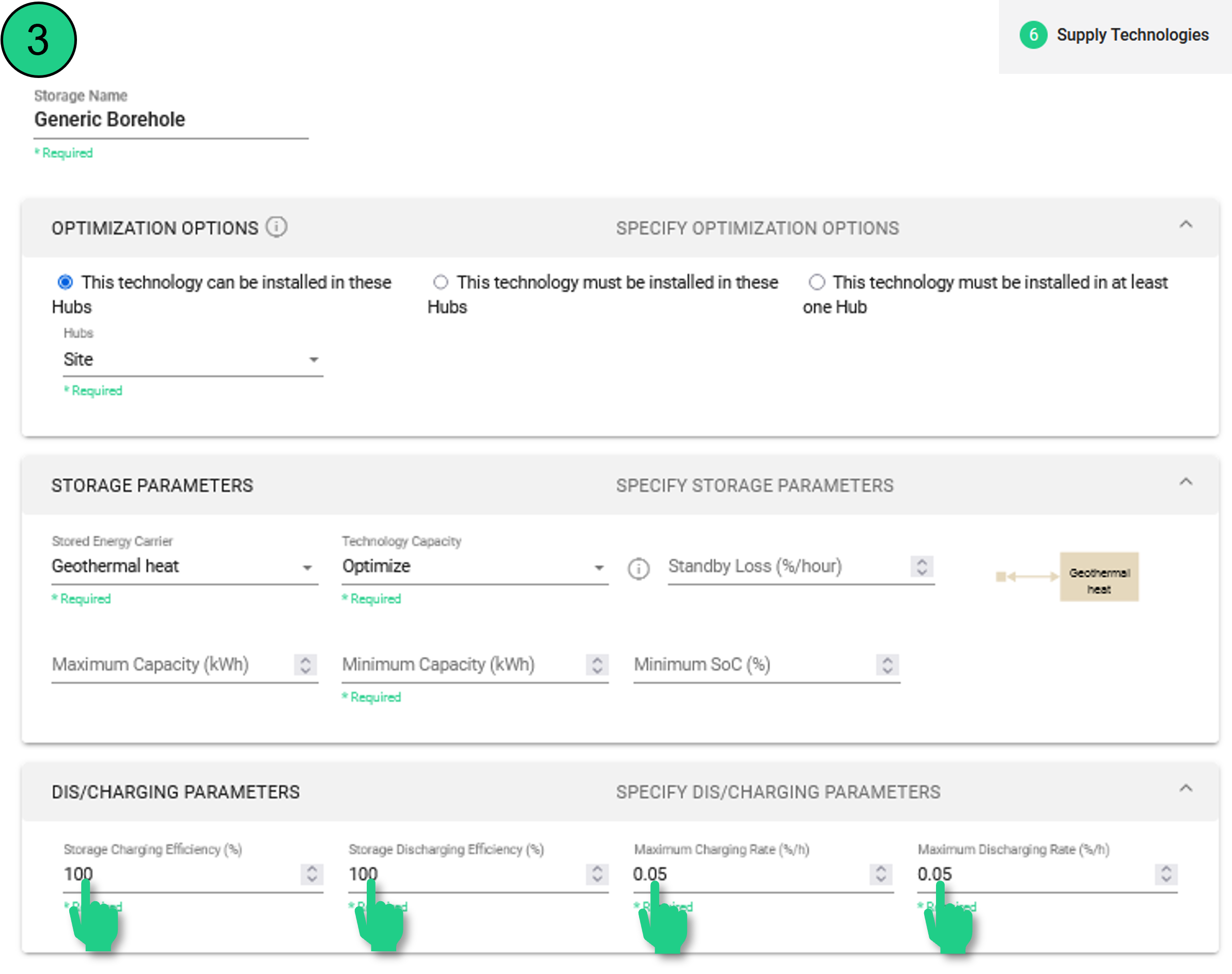 The charging and discharging efficiencies must be set to 100%. Indeed, as the storage technology has the possibility to charge and discharge at the same time, this may result in losses. If the borehole is fully charged, this principle may be used to ‘unload’ the system (by charging and discharging high quantities of energy).
