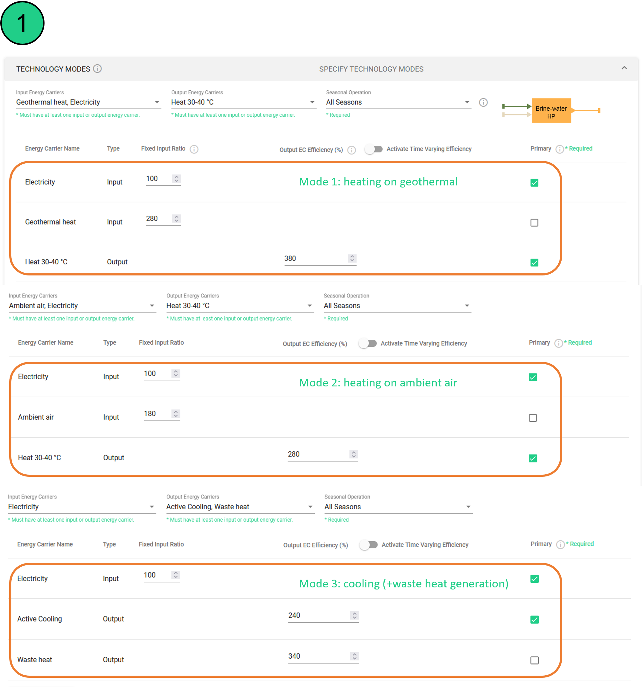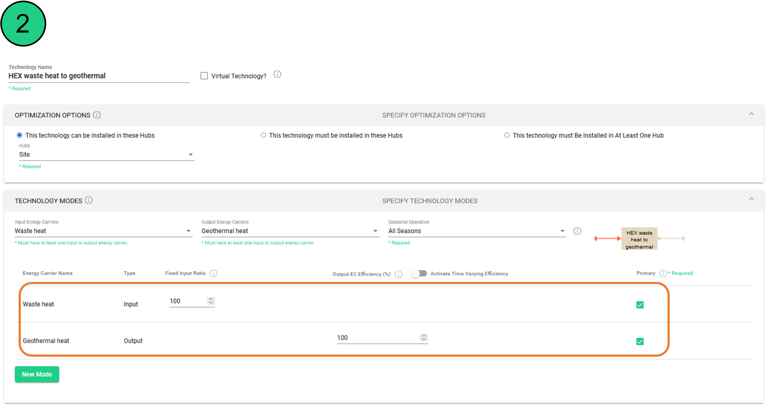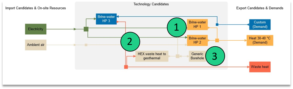 Daher wird der Modus 2 hinzugefügt (Wärmepumpe, die mit Umgebungsluft arbeitet). Dies ist ein Beispiel, und jede andere Technologie hätte modelliert werden können. Im Falle von Abwärme ist dies der Grund, warum ein Export von Abwärme aus dem System modelliert werden muss.