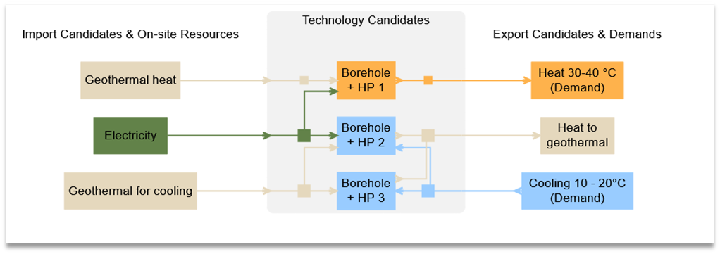 Schließlich muss der Speicher (zur Speicherung des Energieträgers "Erdwärme") hinzugefügt werden. Die maximale Lade-/Entladerate des Speichers ist bei der Betrachtung von Erdwärmesystemen ein entscheidender Parameter, der die Kapazität des Systems beeinflusst. Sie kann durch das spezifische Entnahmepotenzial in W/m, die Bohrlochlänge und die Volllaststunden näherungsweise bestimmt werden.