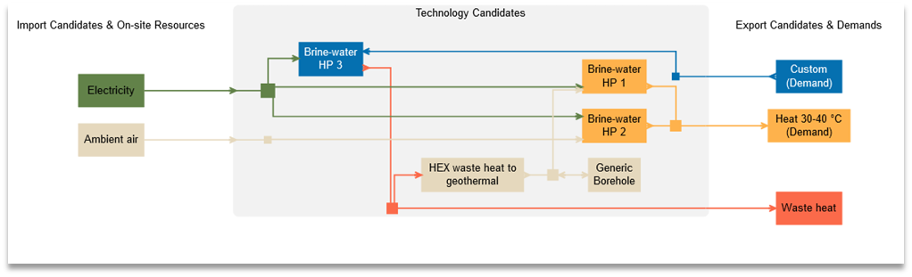 In diesem Fall erfolgt die Modellierung ähnlich wie bei der Grundwasser Wärmepumpe. In diesem Fall muss das Regenerationspotenzial manuell berechnet werden, indem die Menge der importierten "Erdwärme" und der exportierten "Wärme zur Erdwärme" verglichen wird.