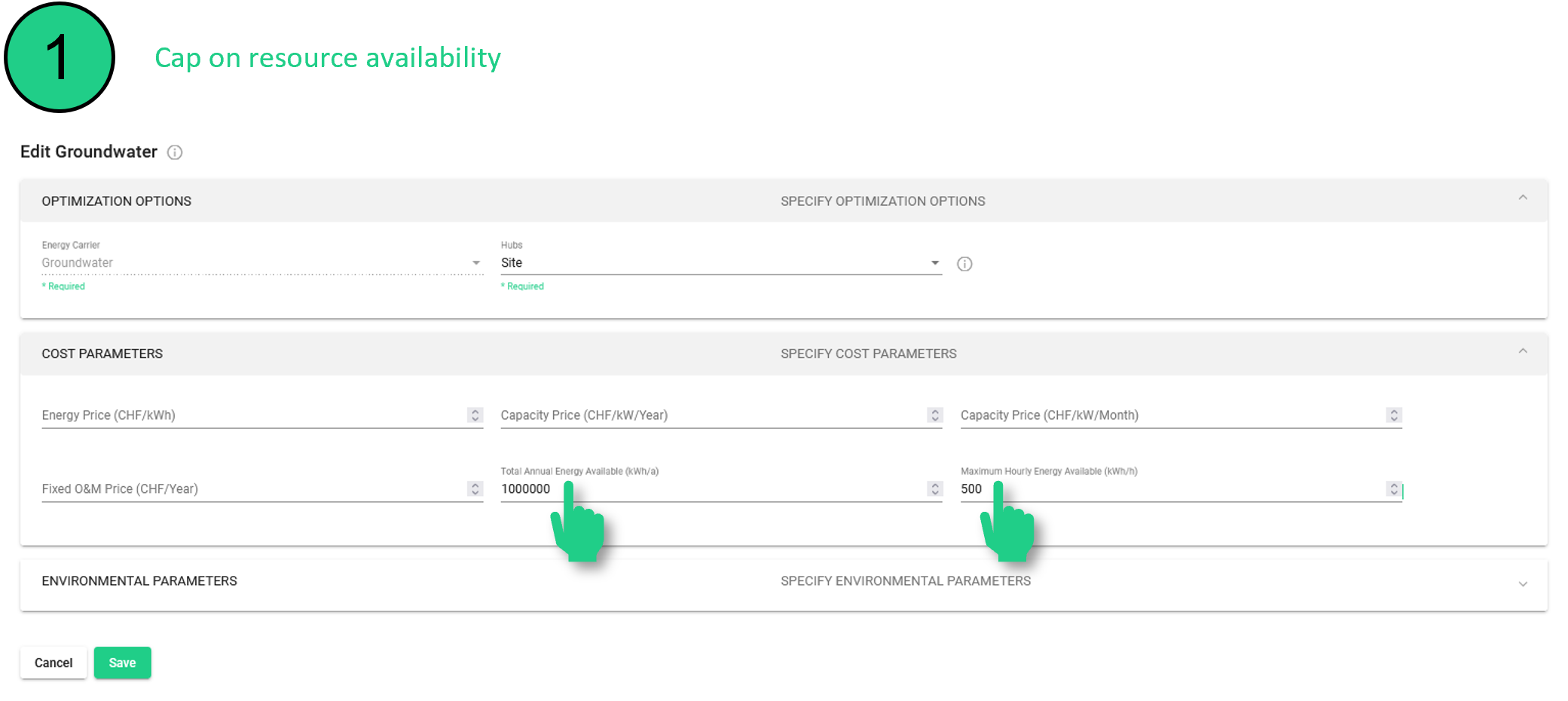 Auf der Registerkarte "Importe & Exporte" kann die maximal zulässige Menge des Energieträgers "Grundwasser" begrenzt werden, um ökologische/gesetzliche Beschränkungen oder die technische Kapazität der Grundwasserpumpe zu berücksichtigen.