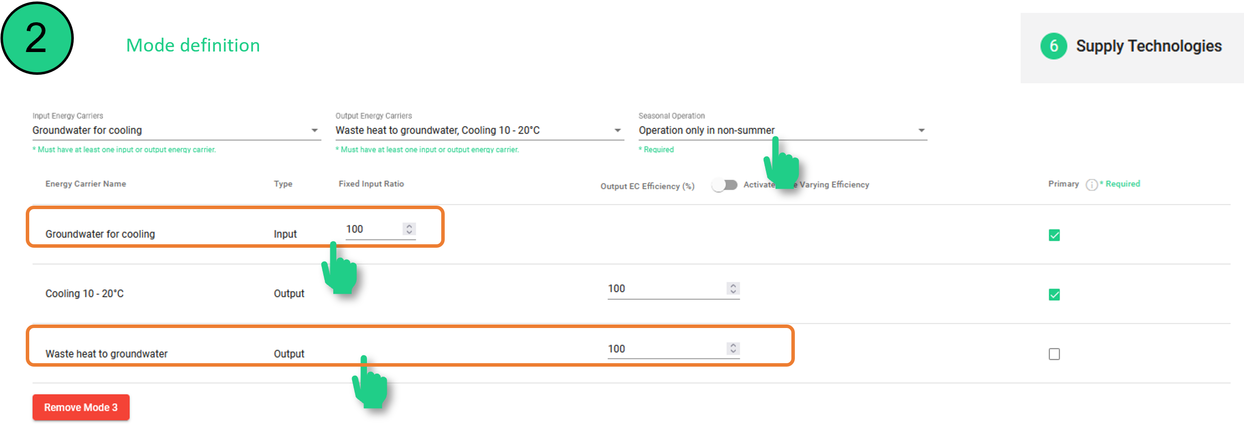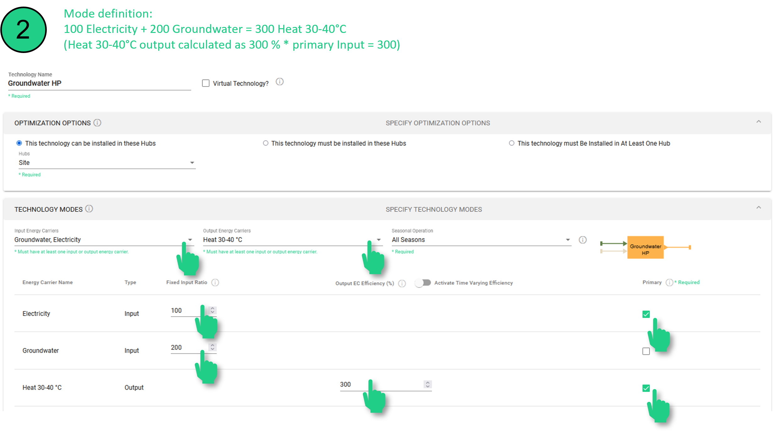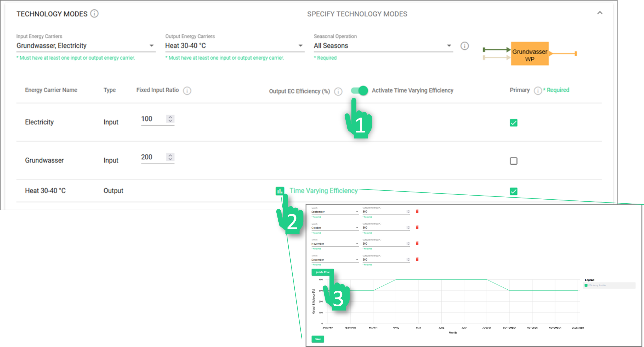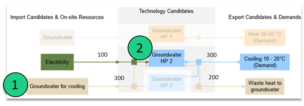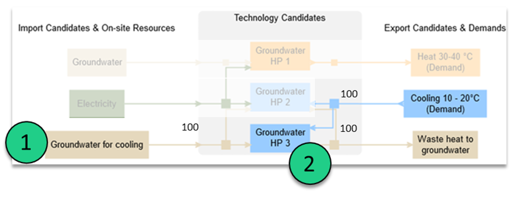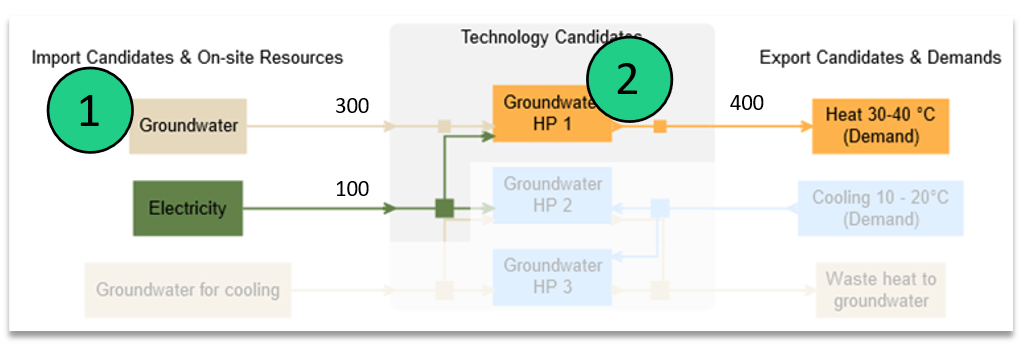 Es sei darauf hingewiesen, dass jeder dieser Modi für sich allein modelliert werden kann. Die Modi einer Technologie können anhand ihrer Namen erkannt werden: Jeder Modus hat seine Modusnummer, die an den Namen der Technologie angehängt ist (z. B. "Grundwasser HP 1", "Grundwasser HP 2" und "Grundwasser HP 3" sind die Betriebsmodi einer einzigen Technologie.