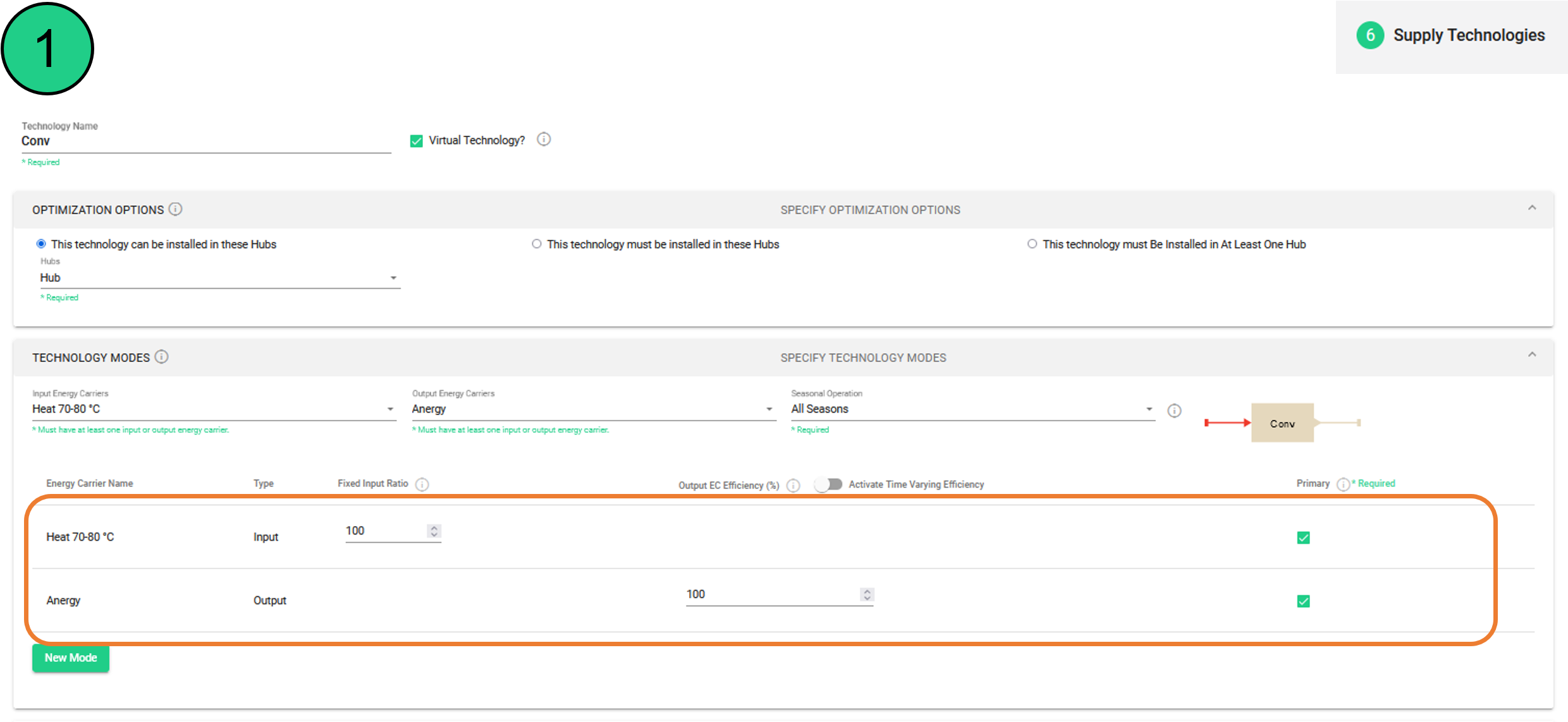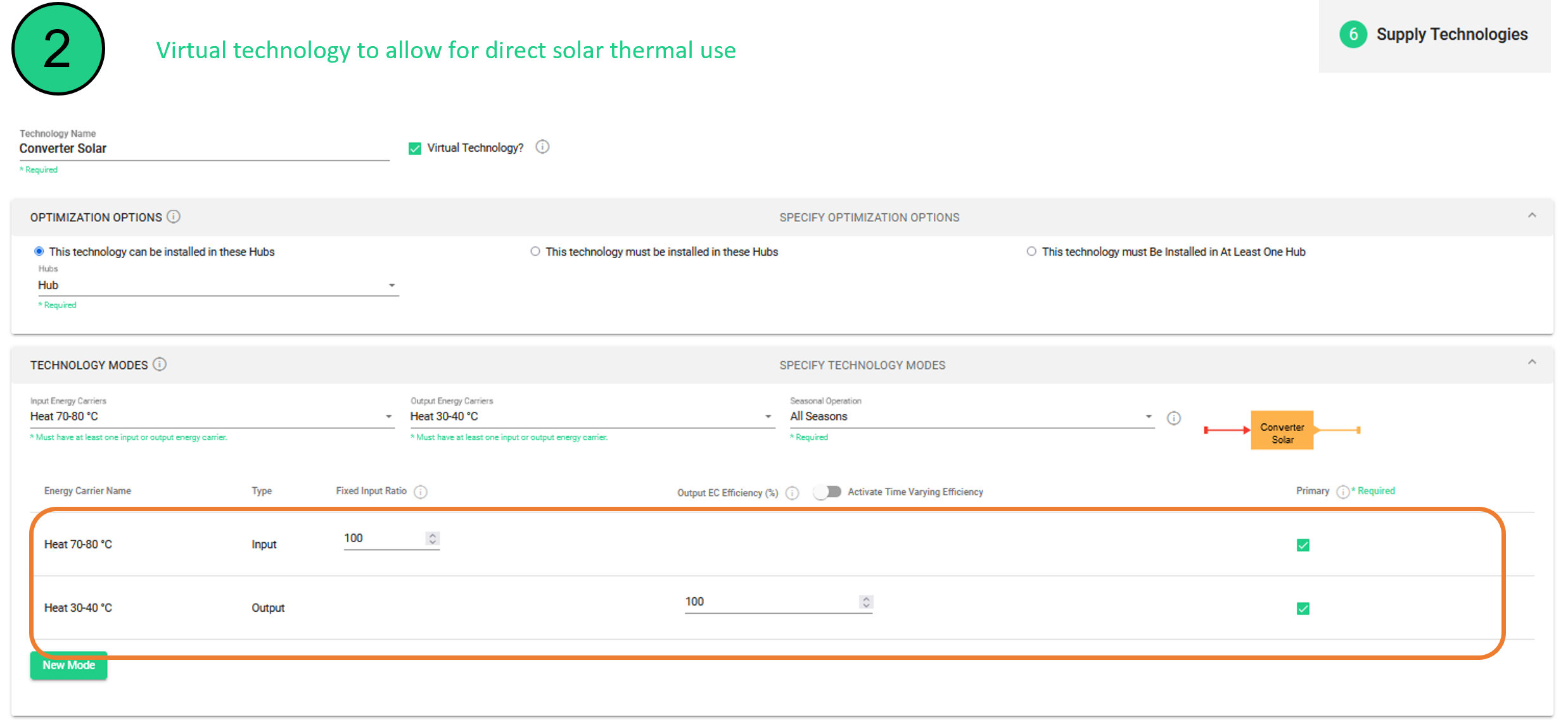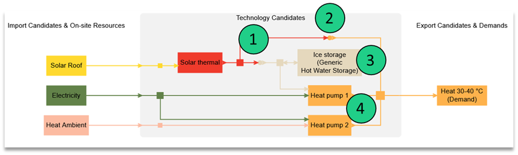 Solar thermal | Heat pump 1 | Heat pump 2 | Virtual technology Solar converter | Virtual technology Anergy converter | Ice storage (Generic Hot Water Storage) | ||||