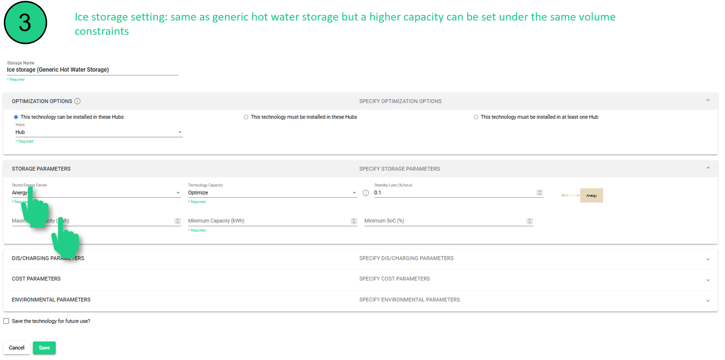 Ice storage is nothing else than a storage where the medium undergoes a phase change. Due to the high energy density release/absorbed during the phase change from water to/from ice, this type of storage will have a higher capacity than a normal hot water storage, for the same volume. This will be reflected in setting the maximum capacity of the ice storage to a consequently higher value than for a standard hot water storage.