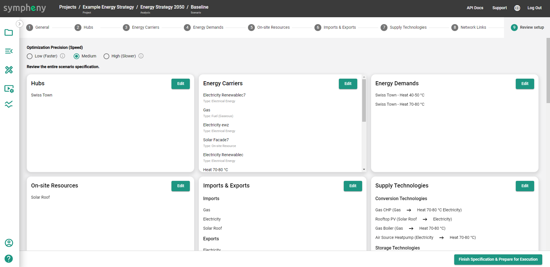 The review section allows to have an overview of the Setup of the entire scenario specification and edit a section if it is needed before execution. The button Finish Specification & Prepare for Execution at the bottom of the page must be clicked before the scenario can be executed.