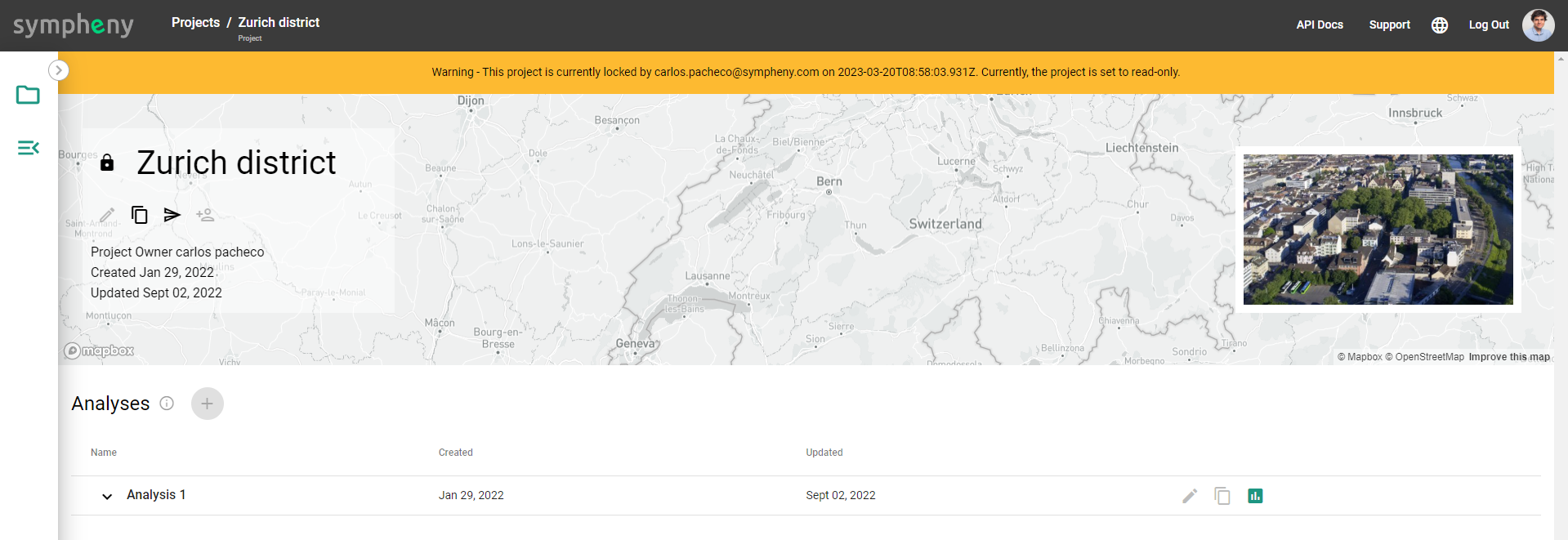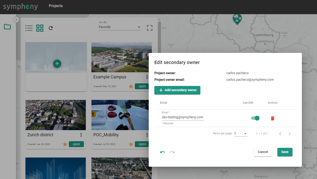 → Send Project Copy: Click on the three points –upper right of each project– and select Send Project Copy. This will send a copy of your project to one of your colleagues, or to any other Sympheny user. Enter the email address corresponding to the users's Sympheny account and click Send.