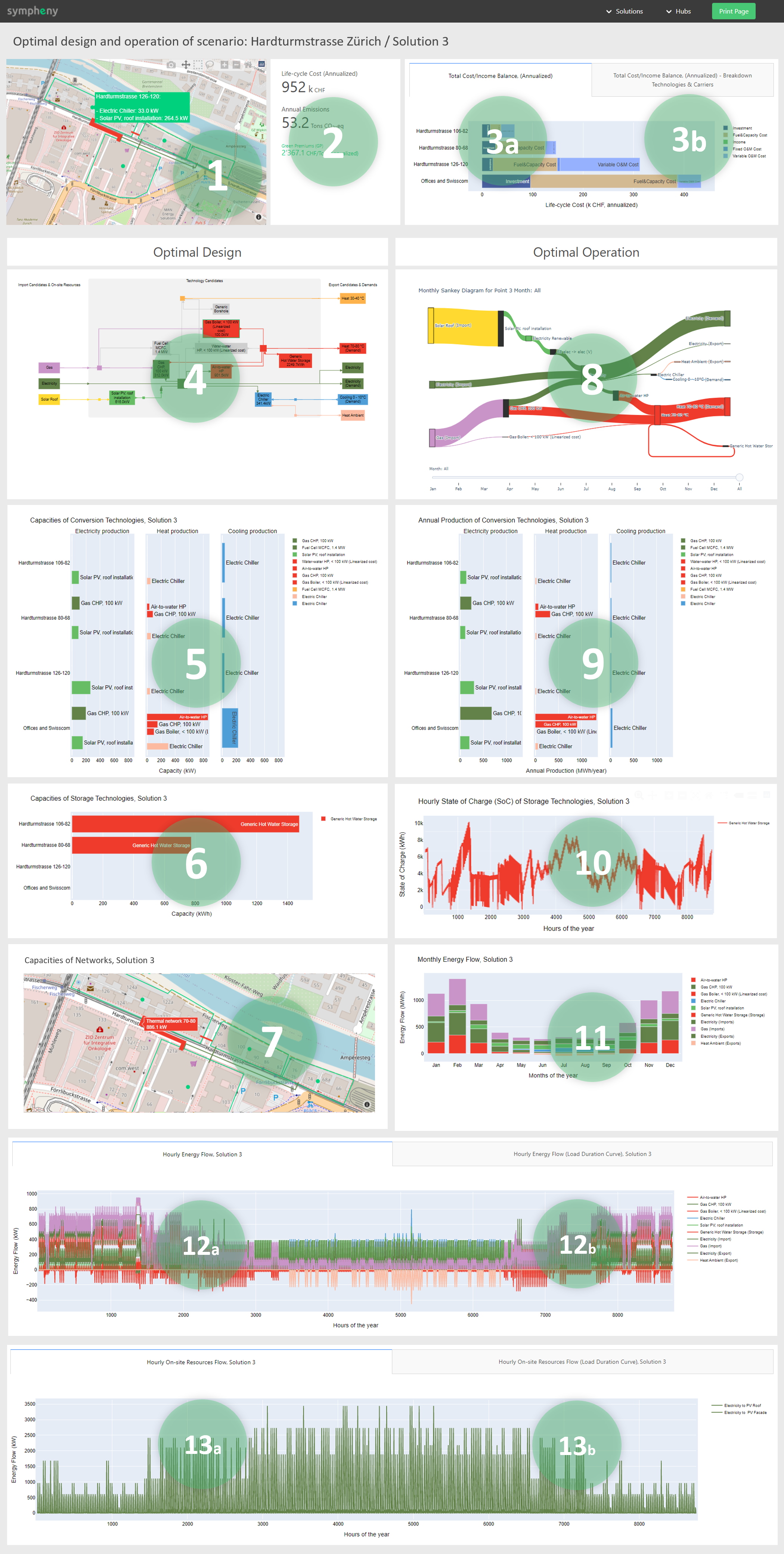 Upon opening the dashboard, you are brought to a Scenario Dashboard that contains an overview of all optimal solutions. On the upper right menu, you can access Solution Dashboards for each optimal solution, and each hub (if more than one was defined in the model).