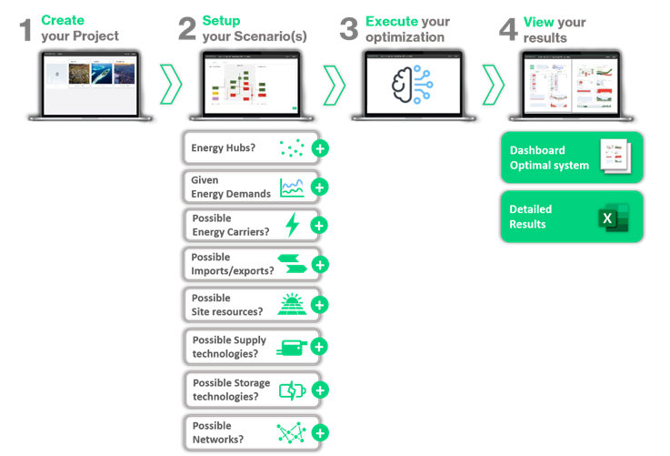 The Sympheny Web app enables the identification of optimal energy supply solutions at a speed and level of detail not previously feasible. This is enabled by Sympheny's powerful optimization algorithms, which quickly and comprehensively sift through thousands of possible supply solutions, and identify the optimal solutions with respect to the planner's objectives. The algorithms solve energy balances for every hour of the year while accounting for complex site-specific supply/demand dynamics, interactions between different energy vectors, and the detailed techno-economic specifications of available technologies.