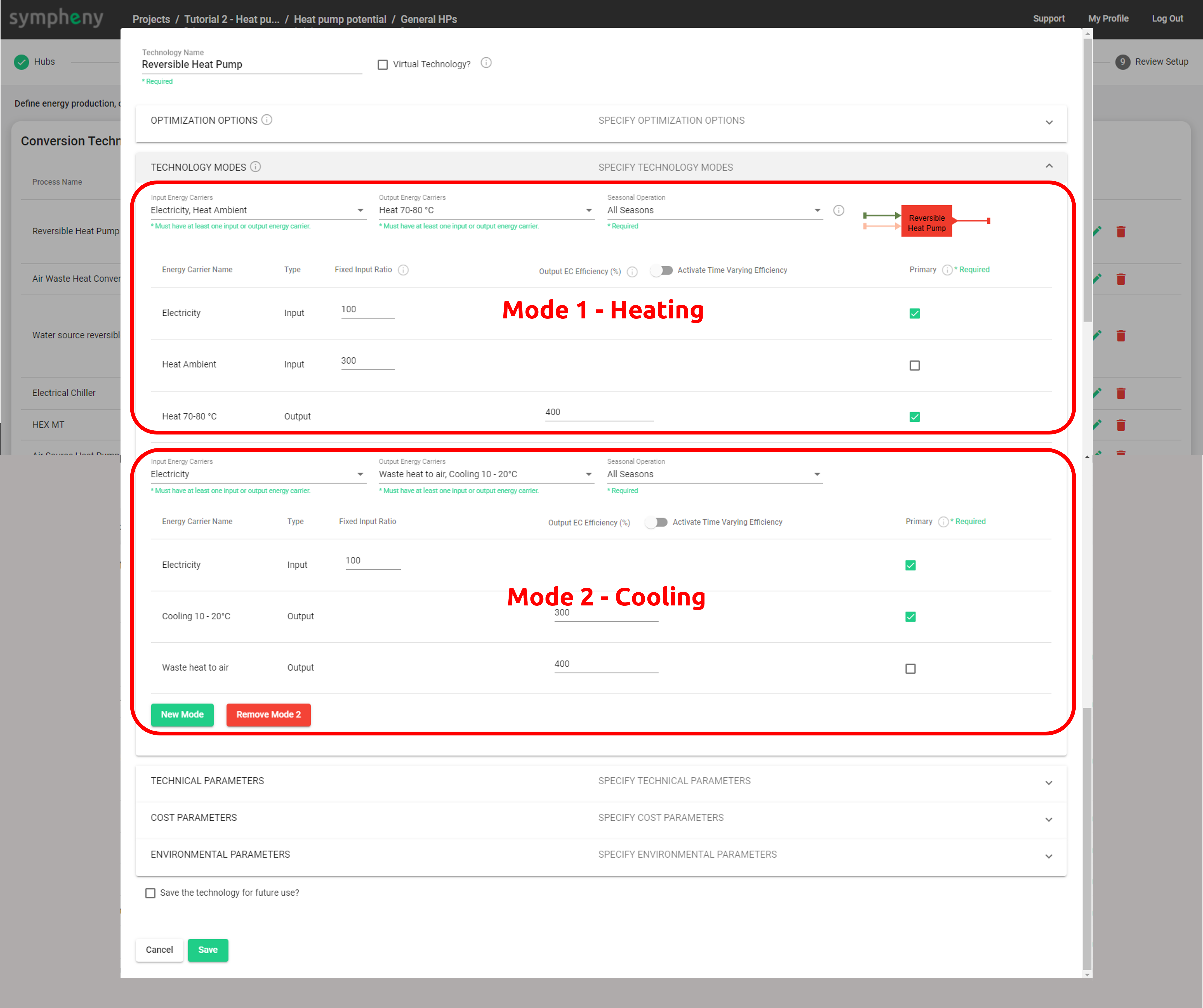 A Technology Mode is an operational "regime" of a technology, corresponding to a specific set of inputs and outputs, and corresponding efficiencies.