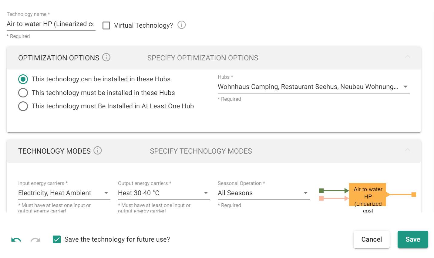 Nevertheless, after adding a specific technology from the scenario editor, the Energy Carriers can be changed to any other ECs that are available in the respective scenario.