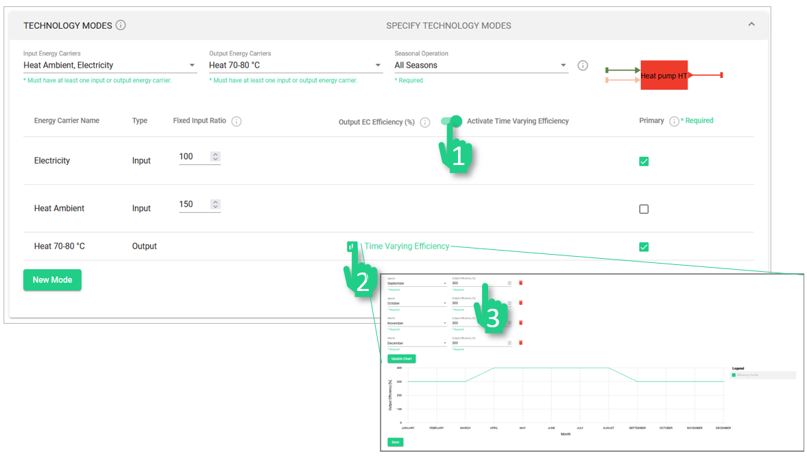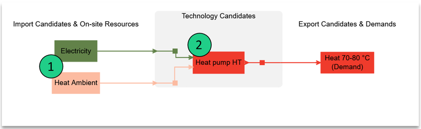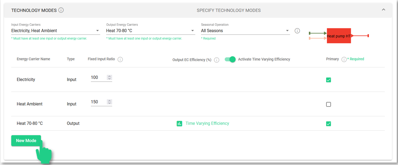 Die Betriebsarten einer Technologie sind an ihren Namen im Systemdiagramm zu erkennen: Jede Betriebsart hat ihre Betriebsartnummer, die an den Namen der Technologie angehängt ist (z. B. "Wärmepumpe HT 1" und "Wärmepumpe HT 2") sind die Betriebsarten einer einzigen Technologie.