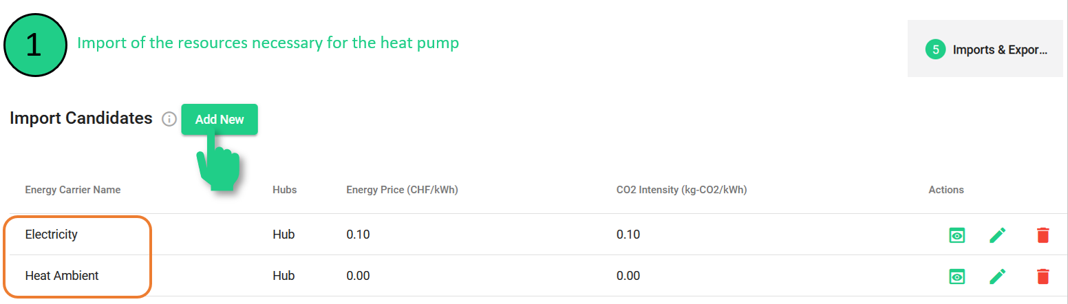 Definition der Eingänge der Wärmepumpe (in diesem Fall Strom und Umgebungswärme) in der Registerkarte Importe & Exporte.