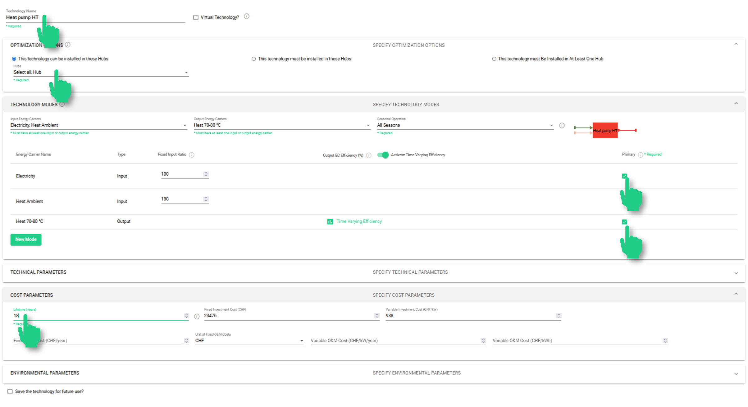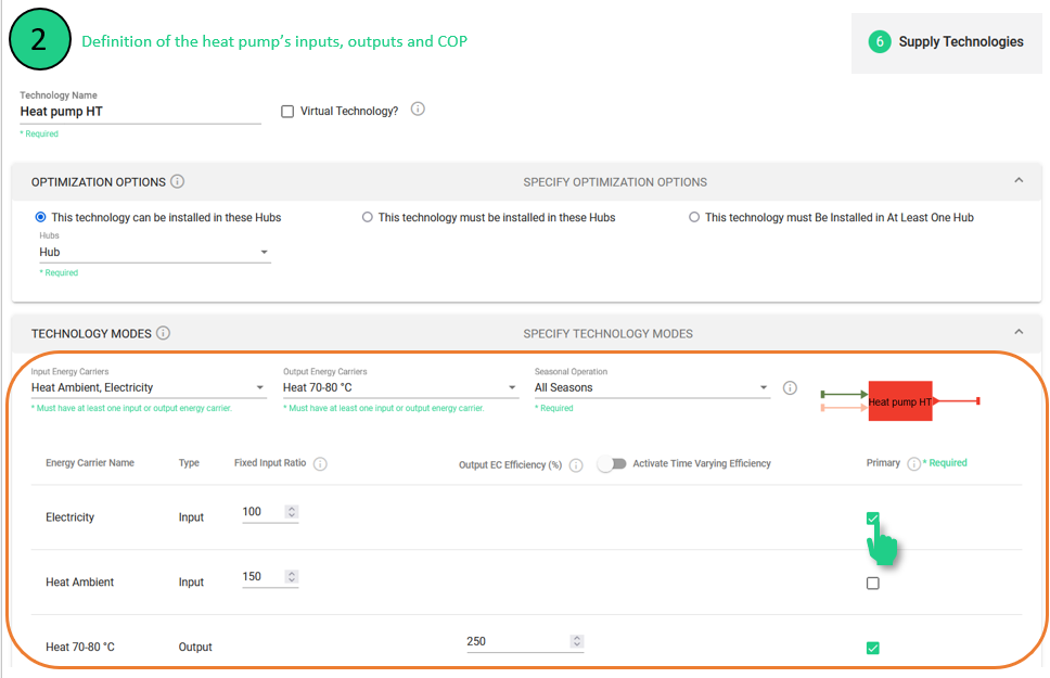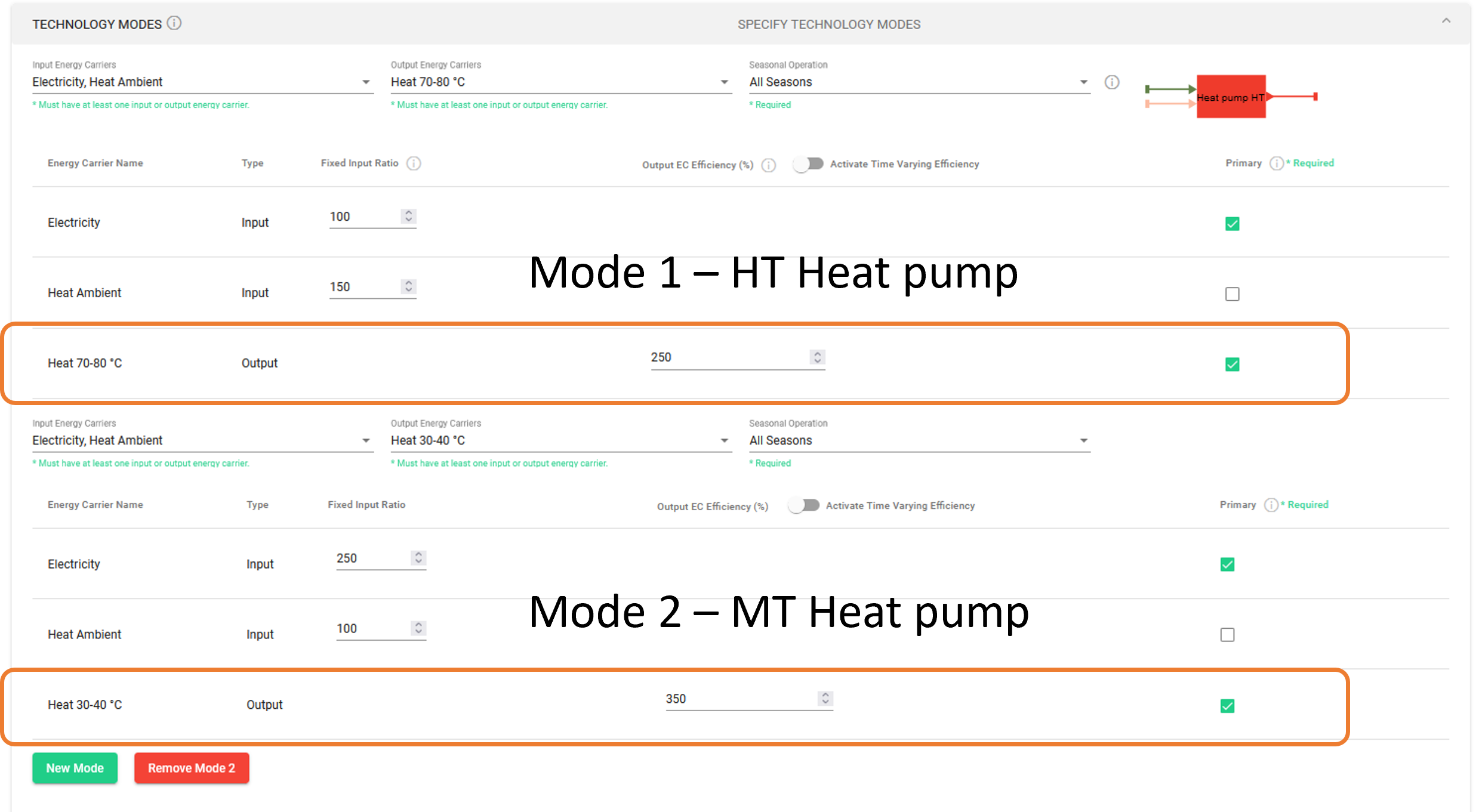 Dadurch wird ein zweites Feld für die Eingabe der zweiten Betriebsart der Technologie geschaffen. In diesem Fall sind beide Modi sehr ähnlich: die einzige Abweichung ist die Art der Leistung (Hochtemperatur- oder Mitteltemperaturwärme) und der entsprechende COP (in Prozent).
