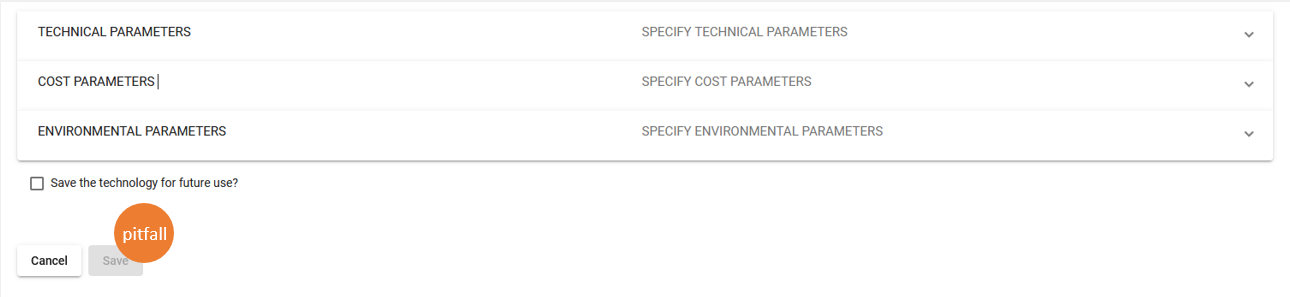 Ein häufiger Fehler ist schließlich das Fehlen eines Eintrags: Technologienamen, Hub, Einstellung der Prüfung für die primäre Eingabe/Ausgabe oder Eingabe der Lebensdauer. Wenn einer dieser Einträge fehlt, ist die Schaltfläche "Speichern" nicht verfügbar.