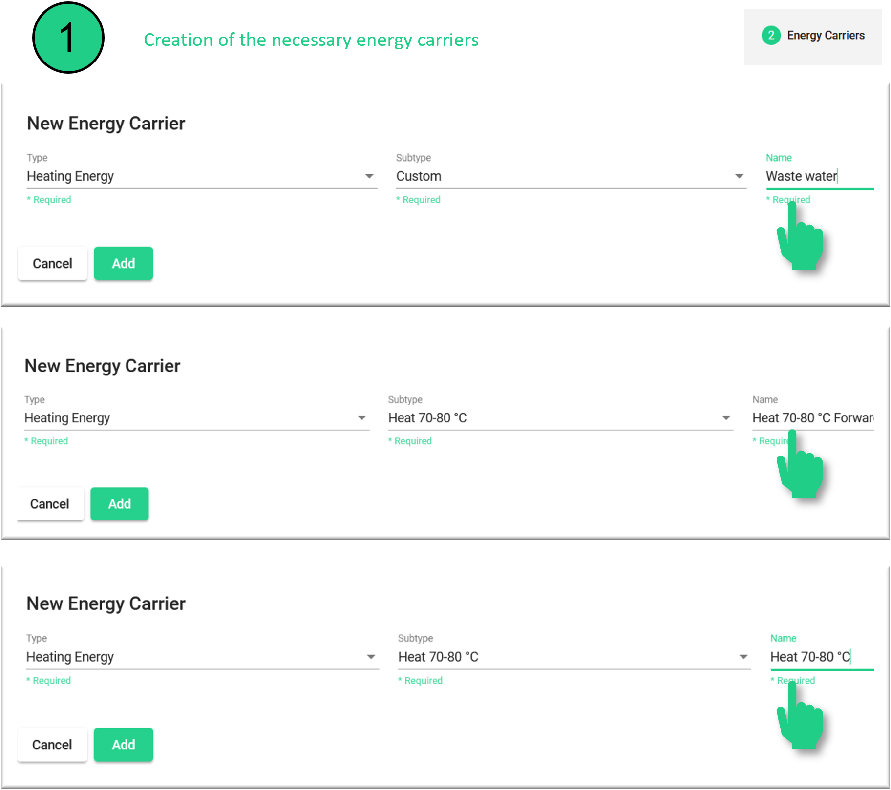 For correctly modelling the wastewater, three energy carriers must be defined (names are up to the users):
